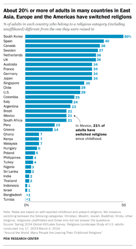 Data ini memperlihatkan pergeseran yang halus tetapi mendasar: di banyak negara, terutama di Asia Timur, Eropa, dan Amerika, sebagian besar orang tidak lagi mempertahankan agama yang mereka warisi sejak kecil. Di Korea Selatan, angkanya bahkan mencapai sekitar 50%. Di negara-negara Barat, kisarannya antara 30–40%. Sementara di Indonesia, angkanya hampir tidak bergerak—sekitar 1%.