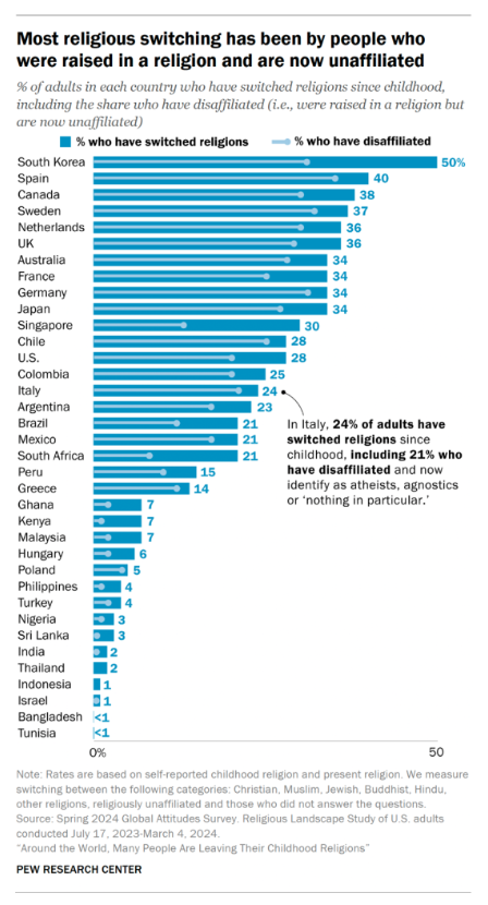 Di Korea Selatan, Spanyol, Kanada, hingga sebagian besar Eropa, angka perpindahan agama tinggi, tetapi mayoritasnya berujung pada disaffiliation—orang-orang yang dibesarkan dalam agama, tetapi kini memilih keluar dari struktur keagamaan formal. Di Italia, misalnya, sekitar 24% mengalami perpindahan, dan sebagian besar dari mereka tidak berpindah ke agama lain, melainkan menjadi ateis, agnostik, atau “tidak beragama secara khusus”.