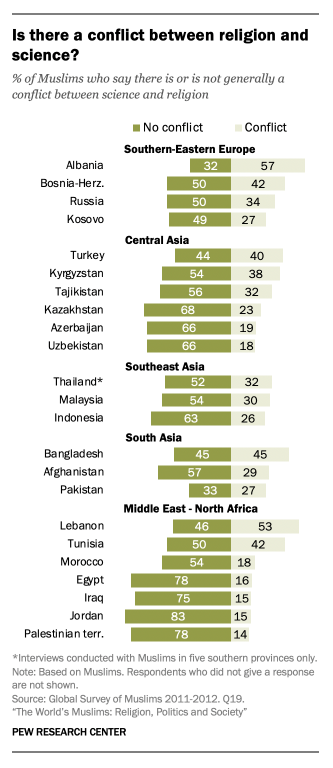 Namun gambaran ini tidak seragam. Di beberapa wilayah seperti Eropa Timur dan sebagian Asia Selatan, persepsi konflik masih cukup kuat. Di Albania, misalnya, lebih banyak responden yang melihat adanya konflik daripada yang tidak. Ini menunjukkan bahwa hubungan antara sains dan agama tidak ditentukan oleh ajaran semata, tetapi oleh konteks sosial, sejarah, dan pengalaman kolektif masing-masing masyarakat.